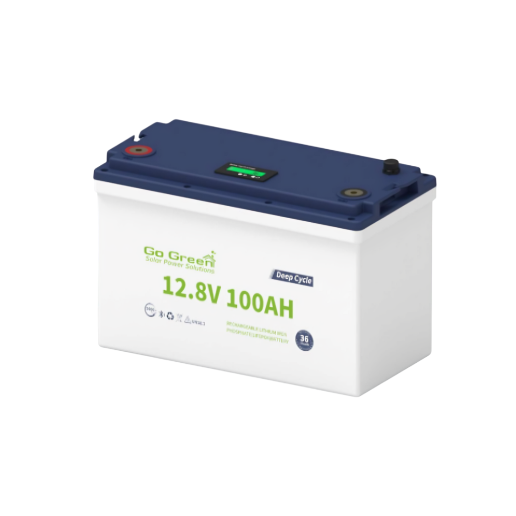 GGESS 12.8V-100Ah LiFePO₄ battery with maintenance-free design, premium Grade A cells, LCD screen, Bluetooth, and advanced BMS protection.